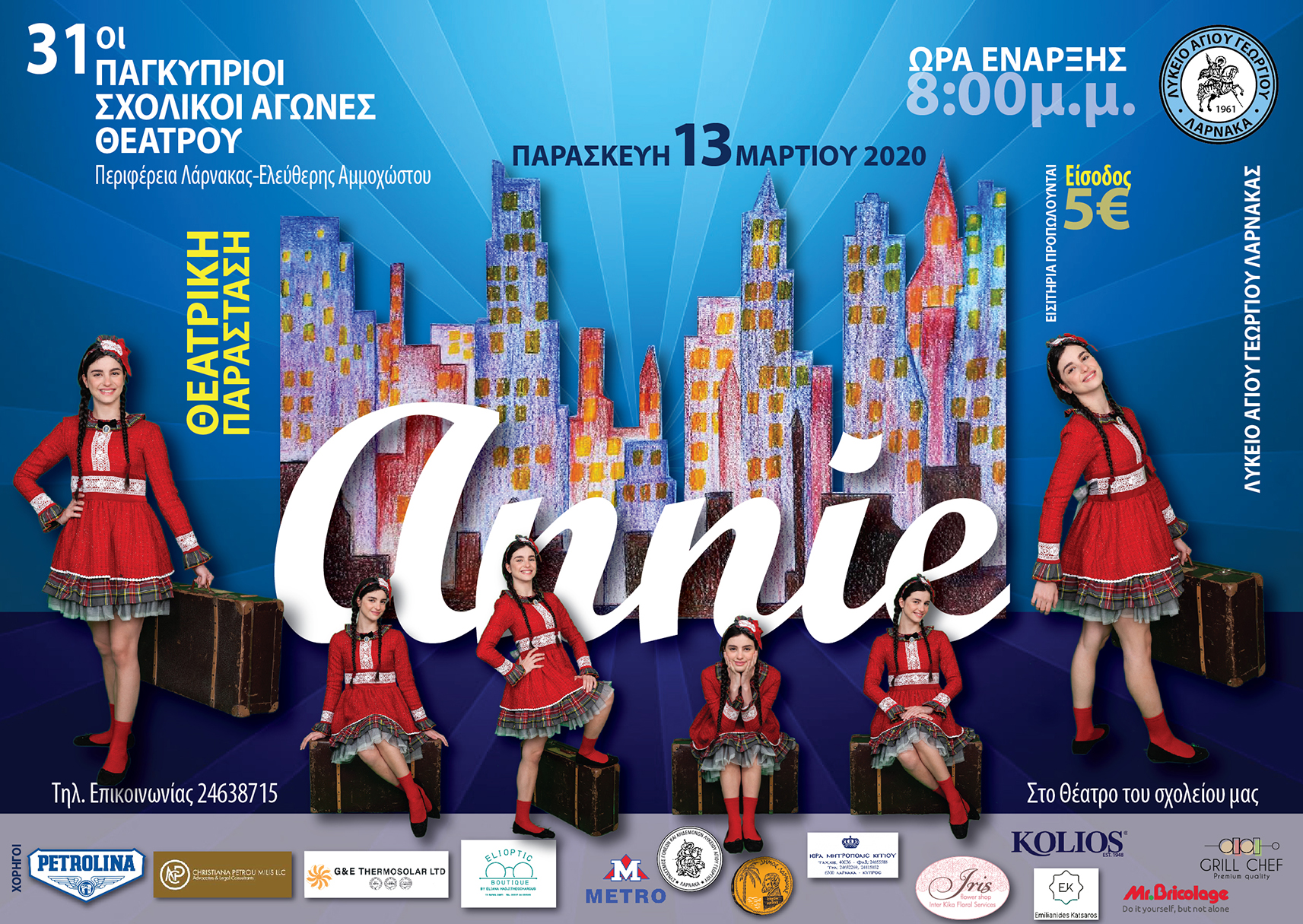 Το Λύκειο Αγίου Γεωργίου, θέλοντας να βοηθήσει όλους μας, μικρούς και μεγάλους, να βιώσουμε το πραγματικό νόημα των Χριστουγέννων, της μεγαλύτερης γιορτής αγάπης, χαράς και αισιοδοξίας, παρουσιάζει το μιούζικαλ Annie! Η ιστορία της μικρής Annie χαρίζει αισιοδοξία και ελπίδα και θυμίζει την ανεκτίμητη αξία της αγάπης και τη ζεστασιά που φέρνει στις καρδιές των ανθρώπων η προσφορά, η ευαισθησία και η τρυφερότητα! Τη θεατρική παράσταση, στην οποία συμμετείχαν μαθητές και μαθήτριες του σχολείου μας, μπορείτε να βρείτε στο πιο κάτω link και συνιστούμε ανεπιφύλακτα να τη δείτε με όλη την οικογένεια! Καλή Θέαση και Καλά Χριστούγεννα!!!