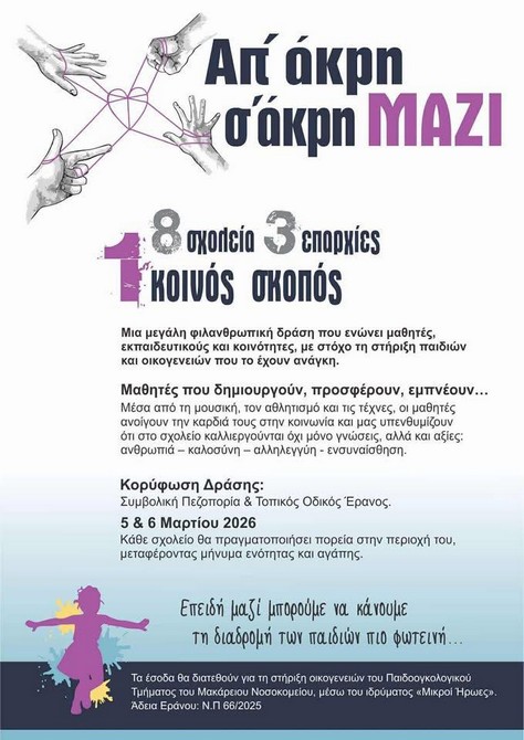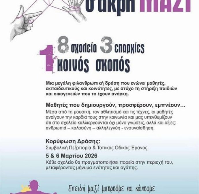 Μια φιλανθρωπική δράση την οποία συνδιοργανώνουν 8 σχολεία από 3 επαρχίες για έναν κοινό σκοπό: Τη στήριξη παιδιών και των οικογενειών τους που δίνουν τη δύσκολη και επώδυνη μάχη με τον καρκίνο.