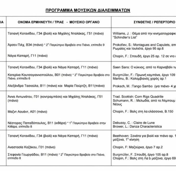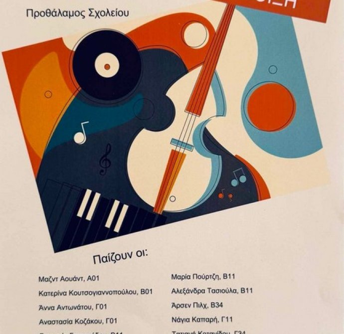 Η εβδομάδα 24.2.25 μέχρι 28.2.2025 ήταν εβδομάδα Μουσικών Διαλειμμάτων! Από τη Δευτέρα μέχρι την Παρασκευή, κάθε 2ο διάλειμμα (διάρκειας 30 λεπτών), στον Προθάλαμο του Σχολείου, απολαύσαμε μουσική με πιάνο, βιολί, κοντραμπάσο από μαθητές και μαθήτριες του σχολείου μας!