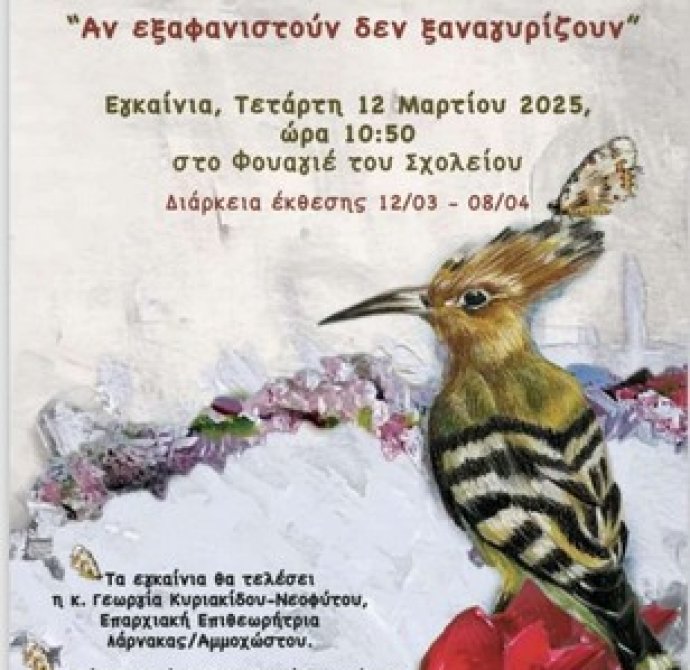 Με μεγάλη χαρά και στην παρουσία μαθητών, εκπαιδευτικών και προσκεκλημένων, πραγματοποιήθηκαν την Τετάρτη, 12 Μαρτίου, από την ΕΜΕ Θρησκευτικών Δρα Ελιάνα Χατζηιωάννου τα εγκαίνια της μαθητικής εικαστικής έκθεσης με θέμα: «Αν εξαφανιστούν, δεν ξαναγυρίζουν», στο φουαγιέ του Λυκείου Αγίου Γεωργίου. Τα έργα των μαθητών αναδεικνύουν τη σημασία της προστασίας της κυπριακής φύσης και την ανάγκη ευαισθητοποίησης των νέων γύρω από το περιβαλλοντικό ζήτημα. Η δράση αυτή εντάσσεται στο Πρόγραμμα Erasmus+ Διαπίστευση, Στόχος 2: «Εκπαίδευση για το περιβάλλον και την αειφόρο ανάπτυξη για έναν πιο οικολογικό τρόπο ζωής», καθώς και στο Πρόγραμμα του Οργανισμού Νεολαίας Κύπρου, «Πράσινος Εθελοντισμός».