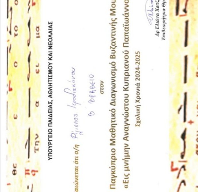 Ο Φίλιππος Ιεροδιακόνου (Γ41) έλαβε το Β' Βραβείο Παγκύπρια στον Παγκύπριο Διαγωνισμό Βυζαντινής Μουσικής, που πραγματοποιήθηκε στη μνήμη του Αναγνώστου Κυπριανού Παπαϊωάννου.