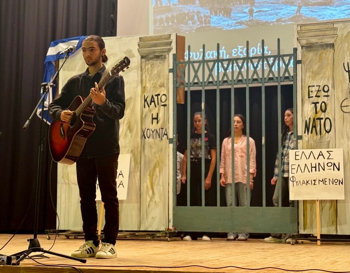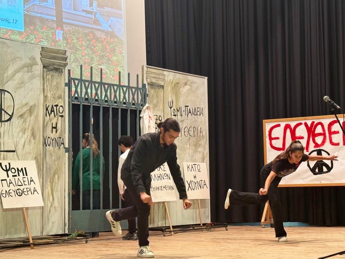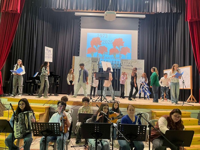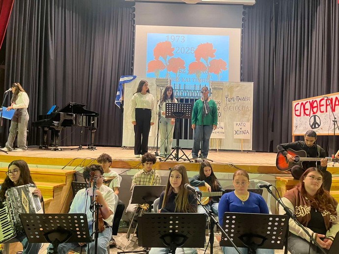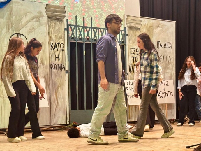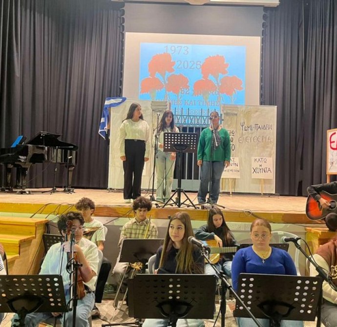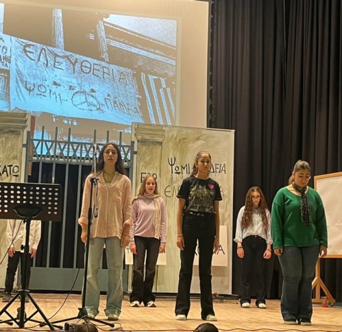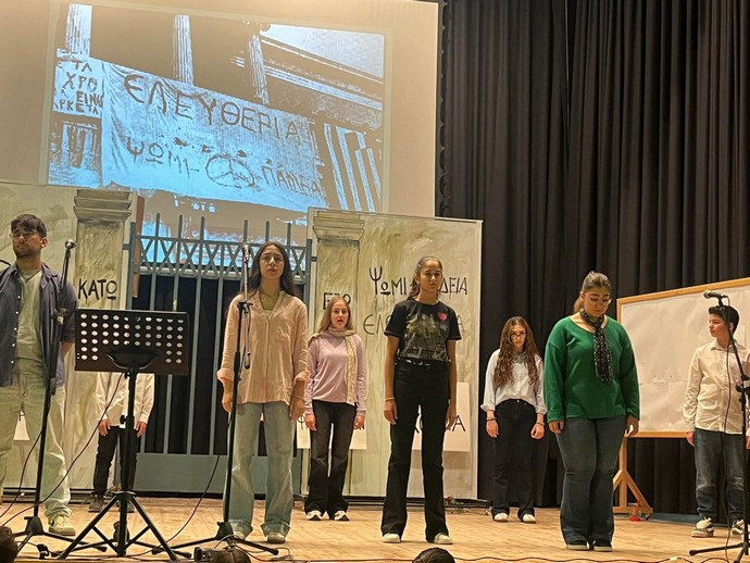 Με την ευκαιρία της συμπλήρωσης πενήντα δύο χρόνων από την ιστορική εξέγερση του Πολυτεχνείου, οι μαθητές και οι μαθήτριες του Λυκείου Αγίου Γεωργίου Λάρνακας τίμησαν, σε μια λιτή και σεμνή τελετή, τους φοιτητές και τις φοιτήτριες που ύψωσαν το ανάστημά τους απέναντι στη Χούντα των Συνταγματαρχών.