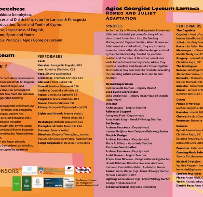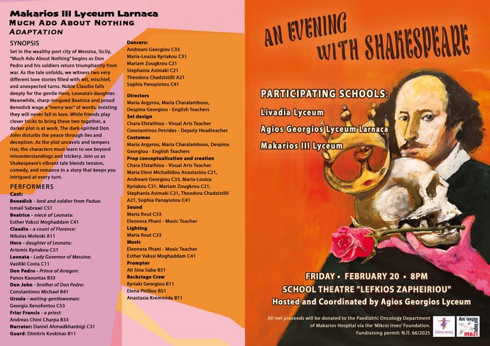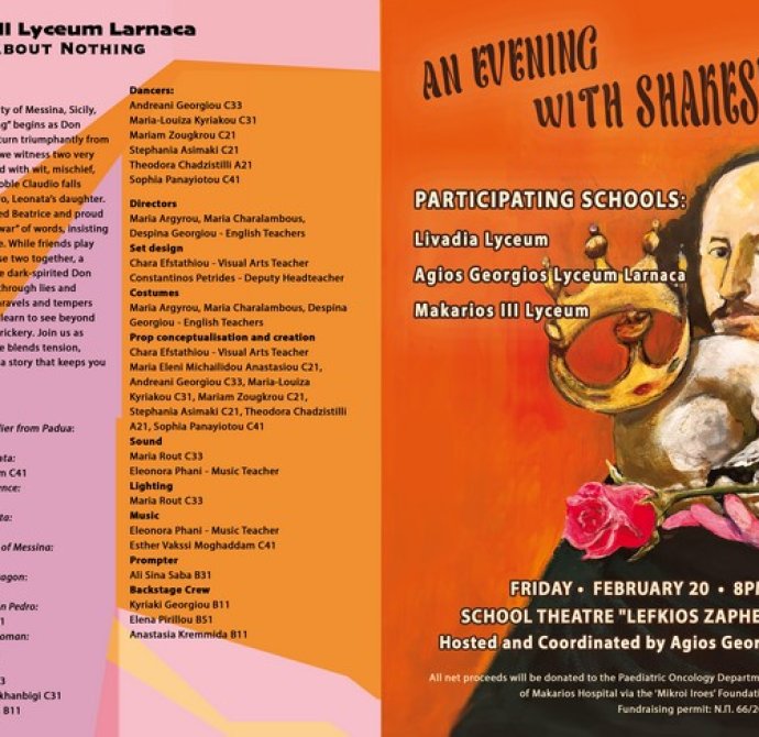 Η θεατρική βραδιά των τριών Λυκείων της Λάρνακας, εμπνευσμένη από τα διαχρονικά έργα του William Shakespeare, ολοκληρώθηκε με απόλυτη επιτυχία, σε μια κατάμεστη αίθουσα και με ένα ενθουσιώδες, κοινό που καταχειροκρότησε τις μαθήτριες και τους μαθητές μας.