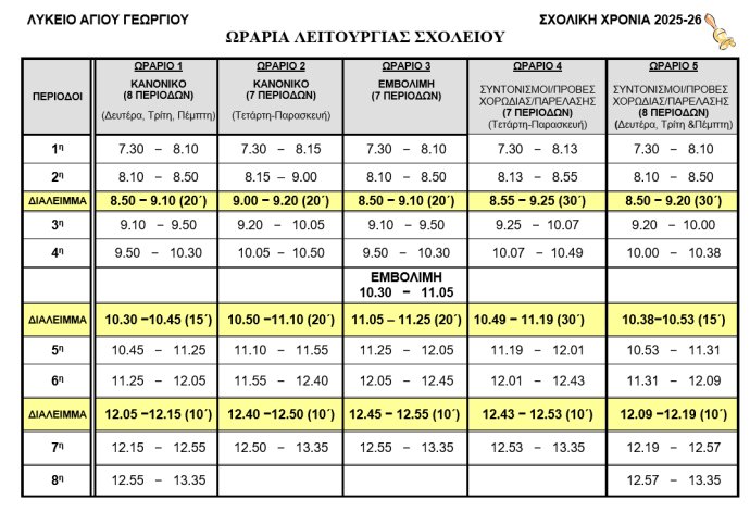 Το ωράριο λειτουργίας του σχολείου είναι καθημερινά από τις 7:30 μέχρι 13:35. Κάθε Δευτέρα, Τρίτη και Πέμπτη διεξάγονται 8 διδακτικες περιόδοι και κάθε Τετάρτη και Παρασκευή διεξάγονται 7 διδακτικές περιόδοι.