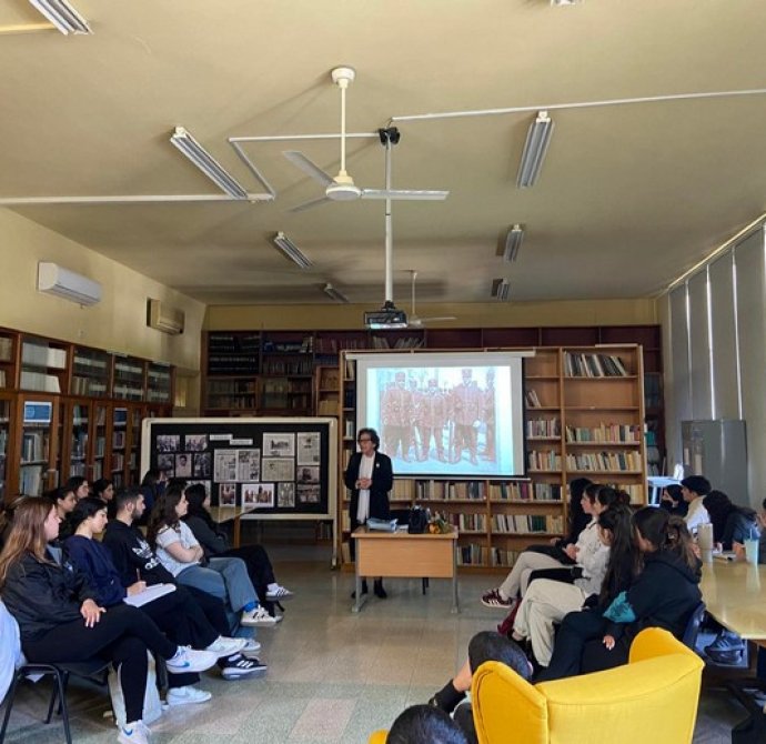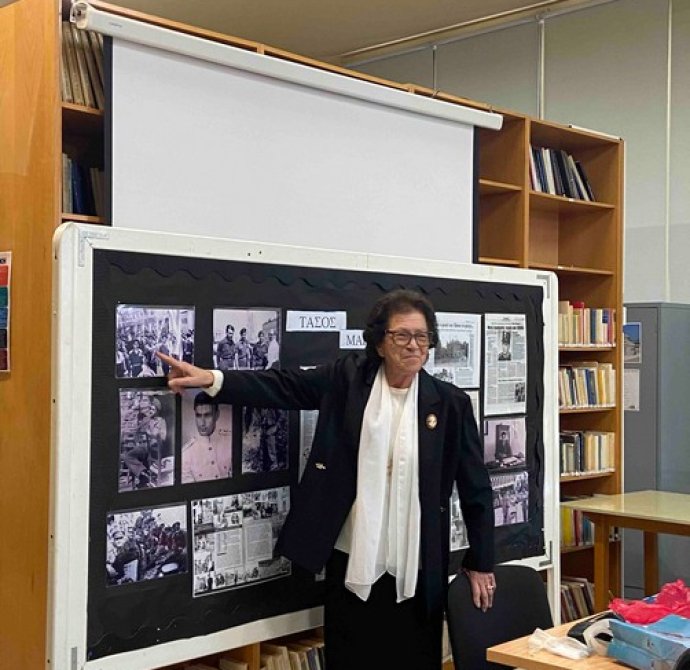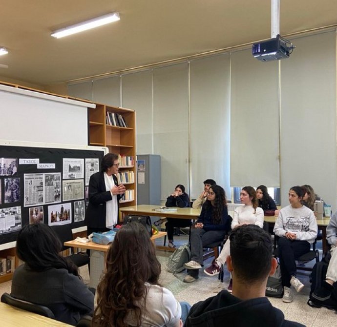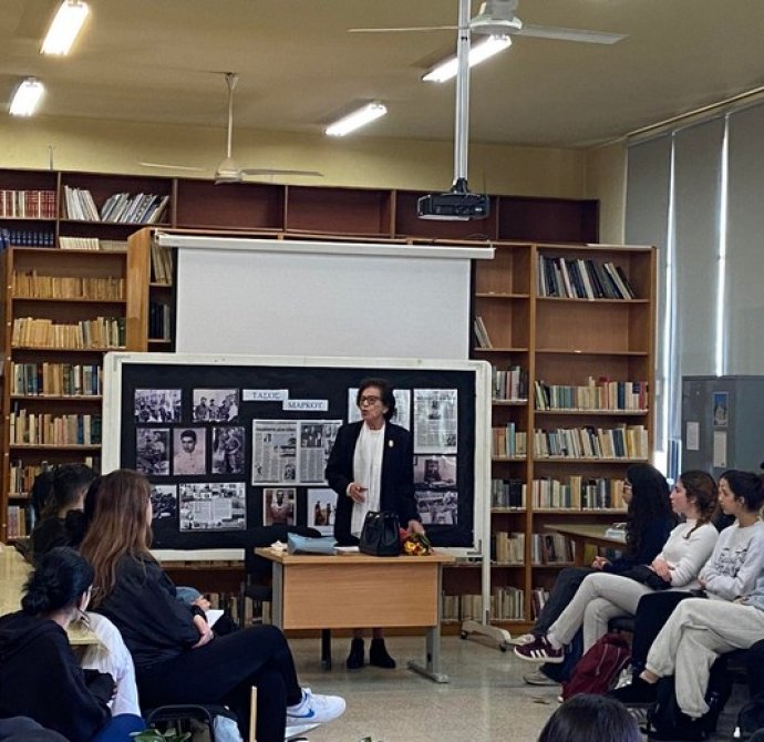 Στις 11 Μαρτίου, στη βιβλιοθήκη του σχολείου μας, η αδελφή του ήρωά μας Τάσου Μάρκου, κ. Μοσφίλη, με λόγια ουσιαστικά και ανθρώπινα κατάφερε να φωτίσει τις πτυχές της ζωής του ήρωα -αγωνιστή του 1955 και του 1974 και να αναδείξει το μεγαλείο της προσφοράς του στην πατρίδα .Η κατάθεση ψυχής της, ήταν ένα μνημόσυνο για τον ήρωα Τάσο Μάρκου, αλλά και ένα μάθημα ζωής για τους μαθητές μας, οι οποίοι παρακολούθησαν με συγκίνηση και σεβασμό. Την ευχαριστούμε θερμά.